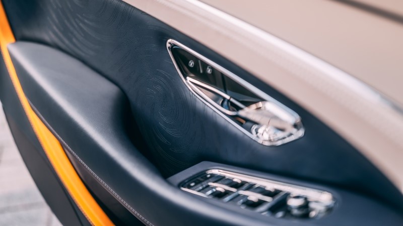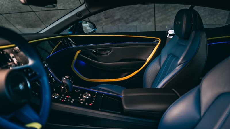 A paleta de cores do interior, em couro Beluga e Azul Oceano, é realçada pela presença do amarelo cítrico como cor de destaque e pelo contraste do debrum dos bancos em um vibrante azul Klein. Para os painéis das portas e a animação da luz de boas-vindas, a equipe de design da Mulliner escolheu a formação de nuvens ondulantes da obra-prima de Vermeer de 1658, A Ruazinha.