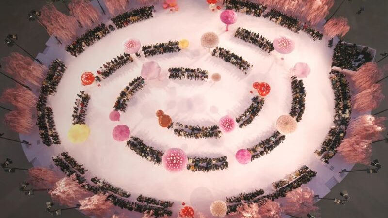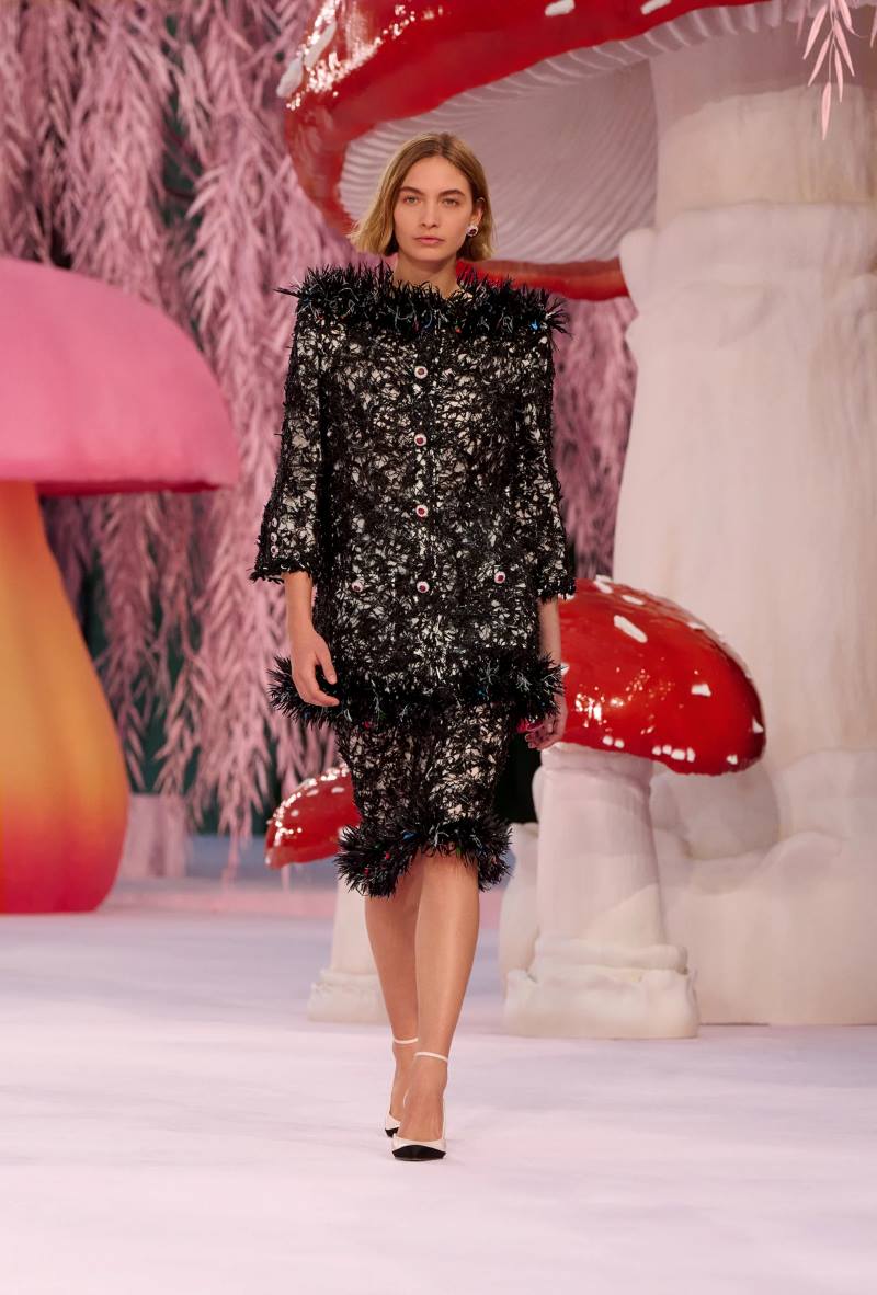 O desfile, realizado sob o teto abobadado de vidro do Grand Palais, não decepcionou. Um círculo de fadas formado por cogumelos gigantes em tons de rosa chiclete, fúcsia, amarelo ensolarado e outras cores vibrantes circundava a passarela — um alívio bem-vindo em meio aos céus cinzentos lá fora.