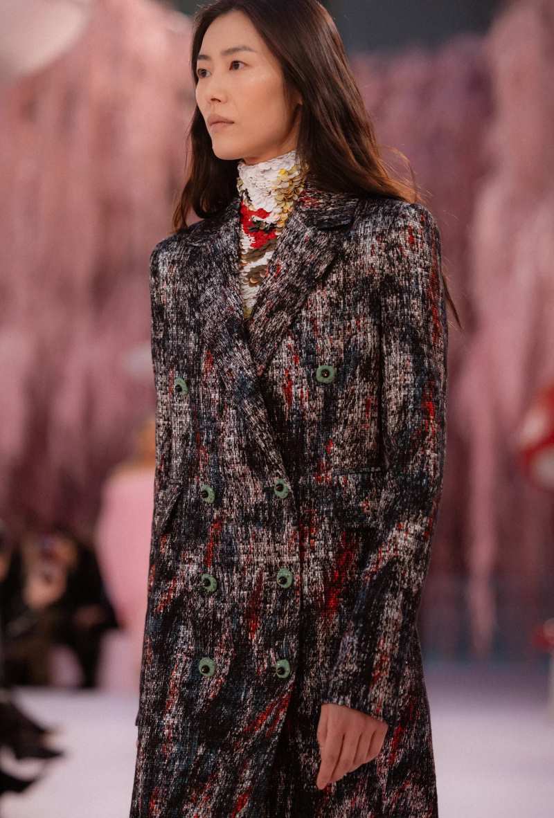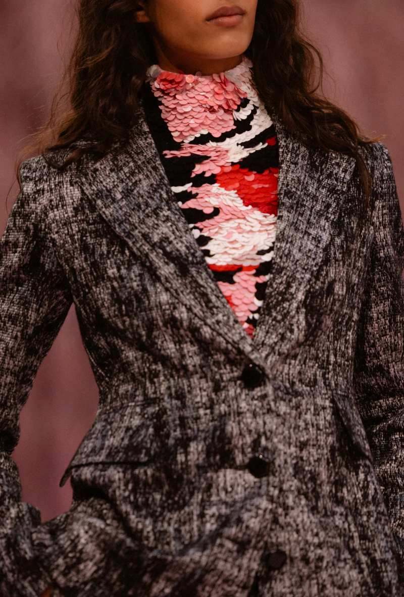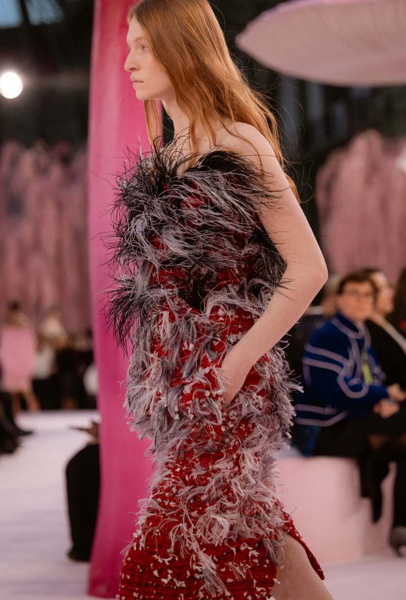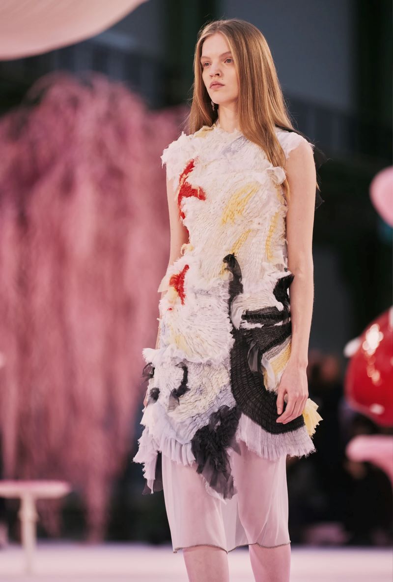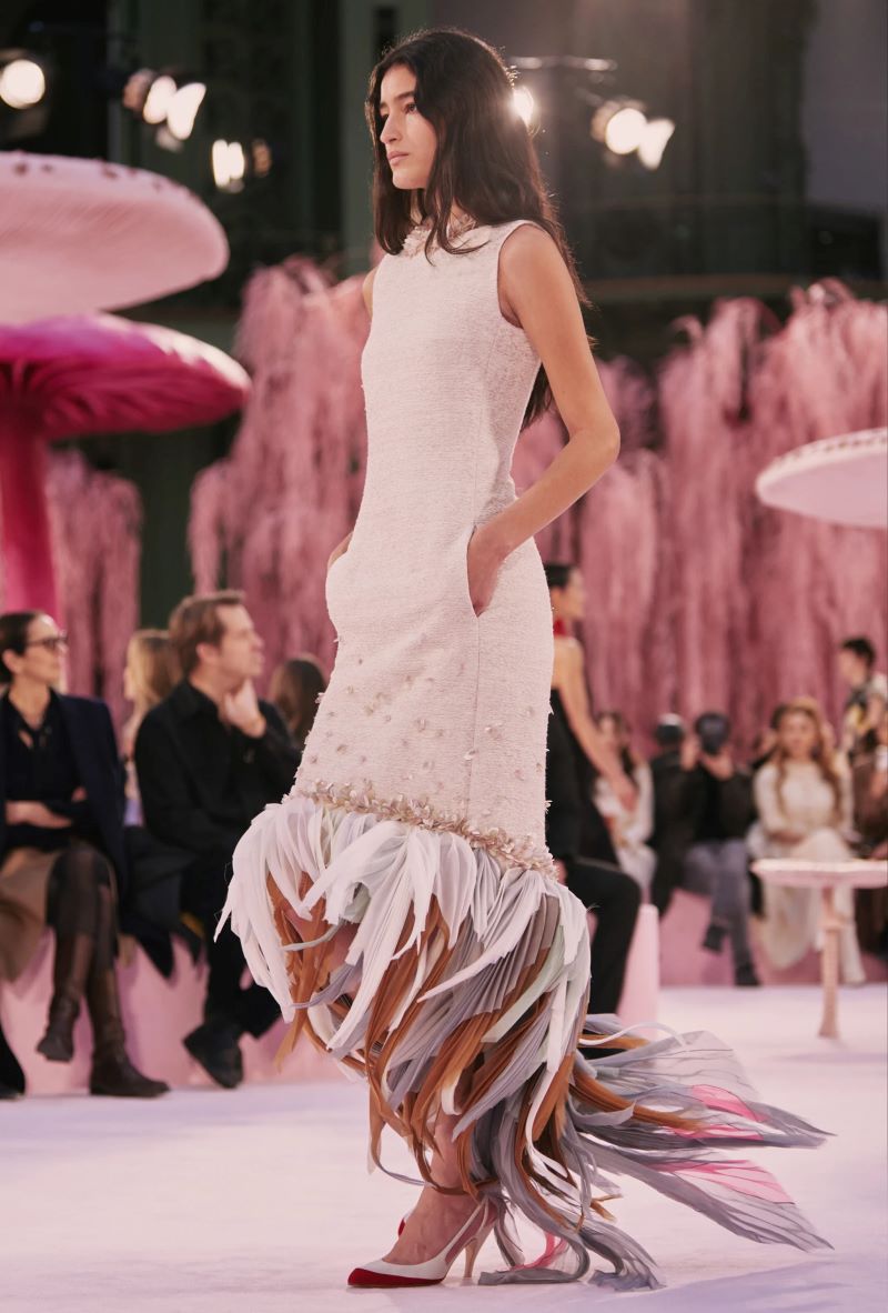 A plumagem surgiu através de bordados, sobreposições, pregas e tecelagem — desde plumagens coloridas vibrantes até um casaco de ráfia preto como corvo, pétalas cinza-pomba em tailleurs quase inexistentes, fios crus simulando penas de pavão em vestidos estilo flapper, e tops plissados esvoaçantes remetendo a guelras na parte inferior. Detalhes da natureza apareciam por toda parte, inclusive nos saltos bicolores em formato de cogumelo dos scarpins.