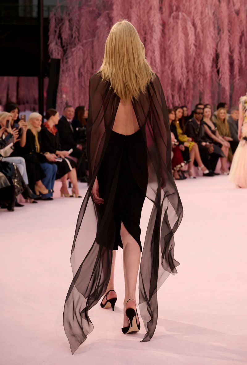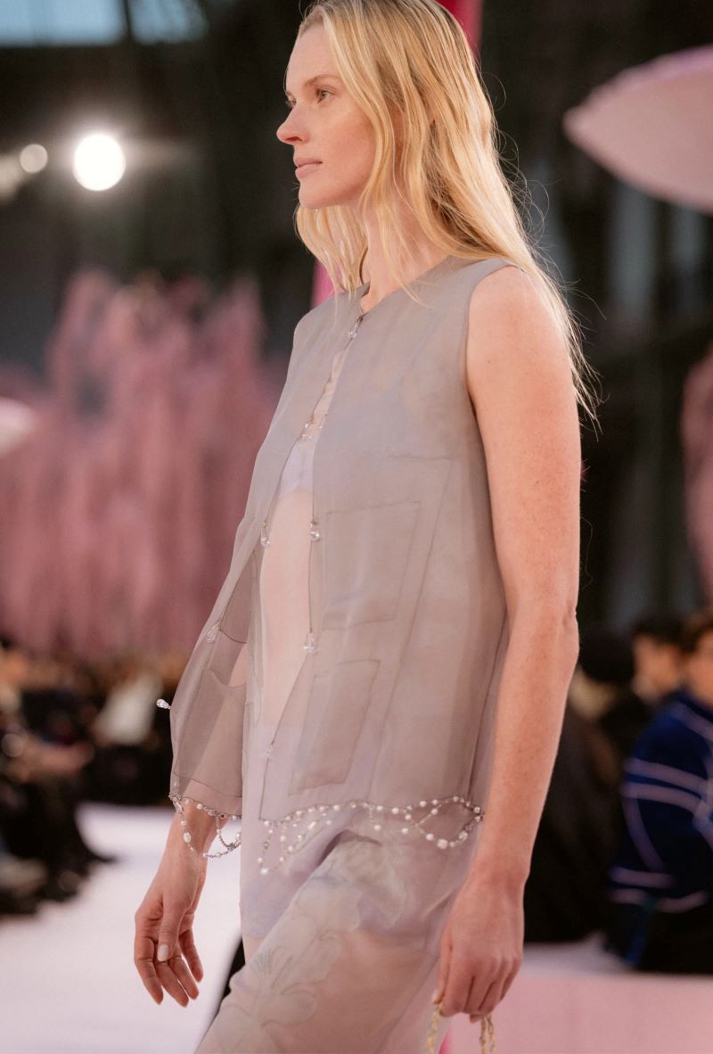 Vestido por Stephanie Cavalli (modelo italiana de quarenta e poucos anos), veio acompanhado de um sussurro de bolsa matelassê derramando uma nota bordada. Essa reinterpretação luminosa evocava as múltiplas camadas da história da maison, tornando-se um palimpsesto recorrente: transparências em camadas surgiam em túnicas pastel usadas sob jaquetas curtas, sobre calças de pernas largas ou saias lápis.
