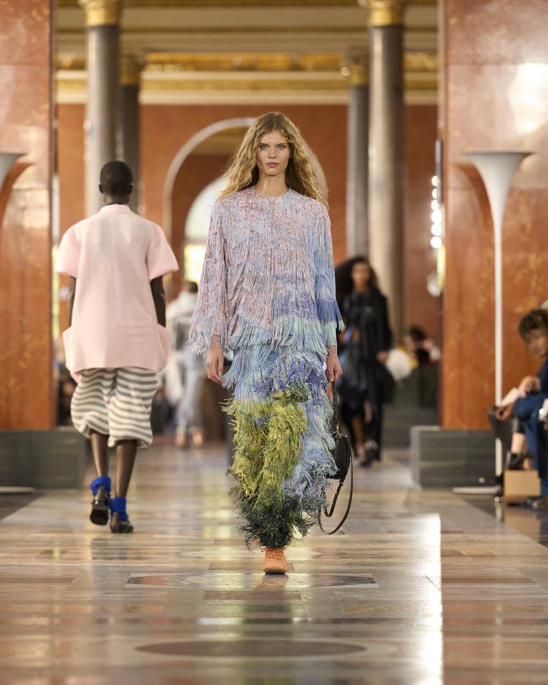 Babados rodopiavam como ecos de brisa, franjas esvoaçavam a cada passo, e bordados florais – delicados jacquards – pontuavam peças versáteis de prêt-à-porter.