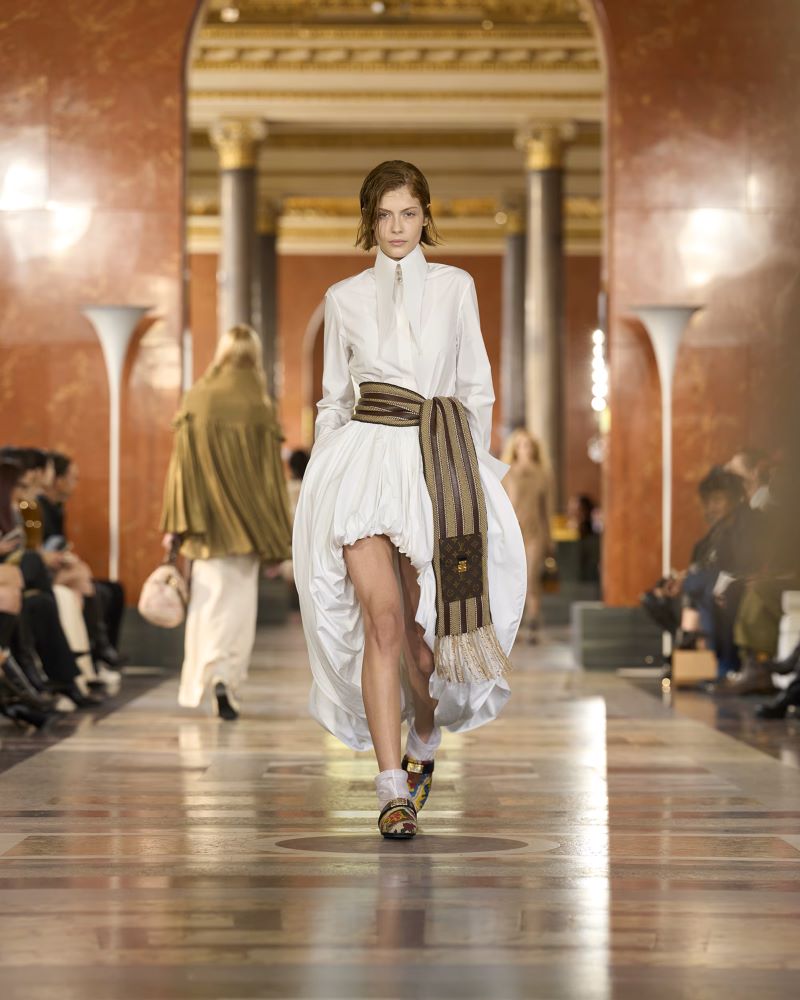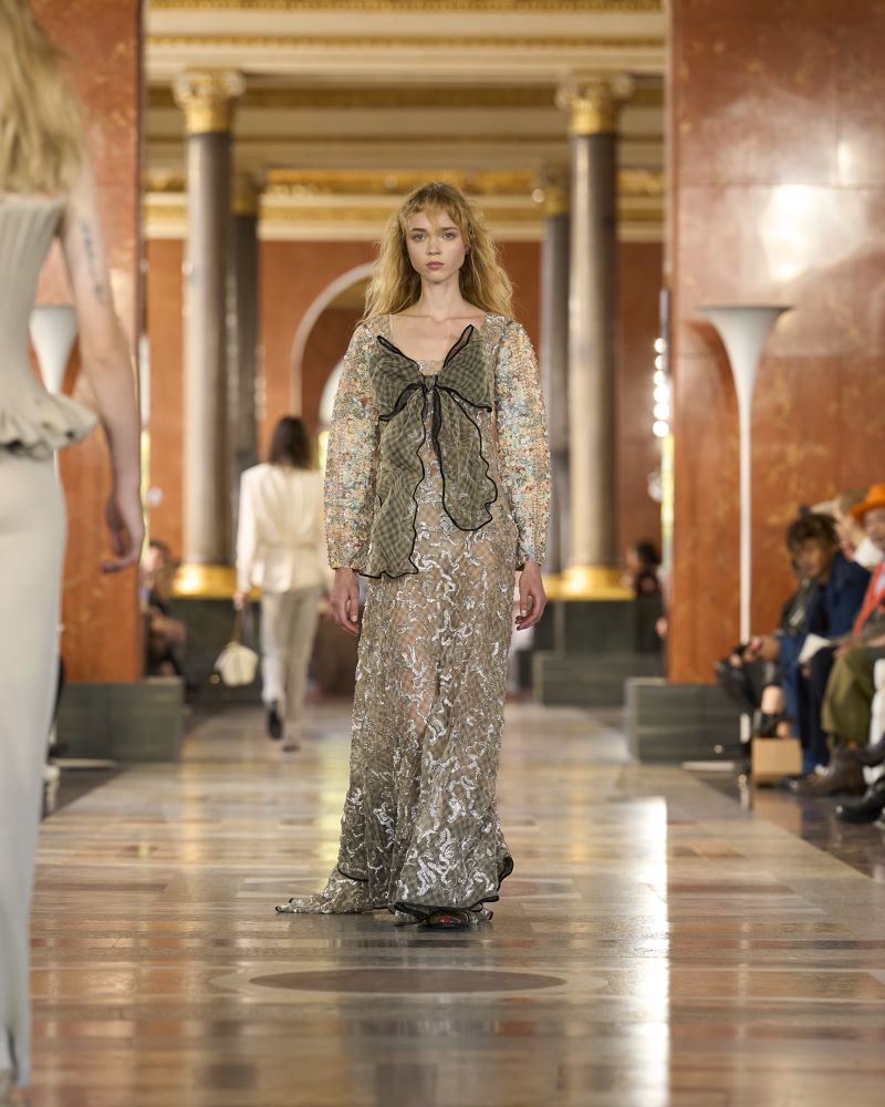 Havia confiança discreta nos contrastes: lingerie como traje de noite, silhuetas de pijama salpicadas de bordados relíqueos, vestidos de lantejoulas transparentes com laços joviais, camisas brancas ou camisolas que transitam da esfera privada à pública sem esforço. Bolsas e nécessaires reinventadas e uma seleção extravagante de sapatos – híbridos de chinelo e bota, sapatilhas para palácios invisíveis – transcendiam os estilos icônicos da Maison.