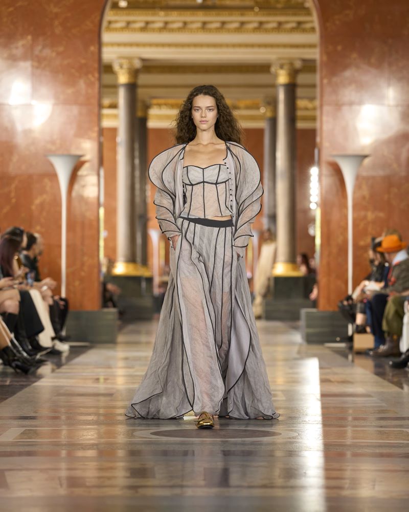 O look de abertura capturava essa essência: uma peça translúcida, equilíbrio sutil entre vestido e robe, revelando o eu interior com transparências debruadas em preto, como veias de confidência.