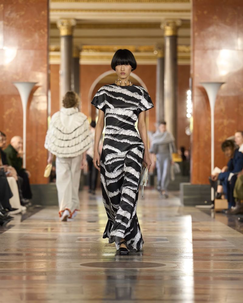 Esse opulento conjunto de cômodos guiava o público por um gosto francês do século XVIII aos dias atuais, ecoando a narrativa da coleção como uma subversão lúdica de códigos históricos, onde o passado não pesa, mas flutua como névoa sobre o presente, com tetos afrescados e maquetes romanas formando uma tela imersiva prévia de silhuetas que dançavam entre o solto e o estruturado, o privado e o público.