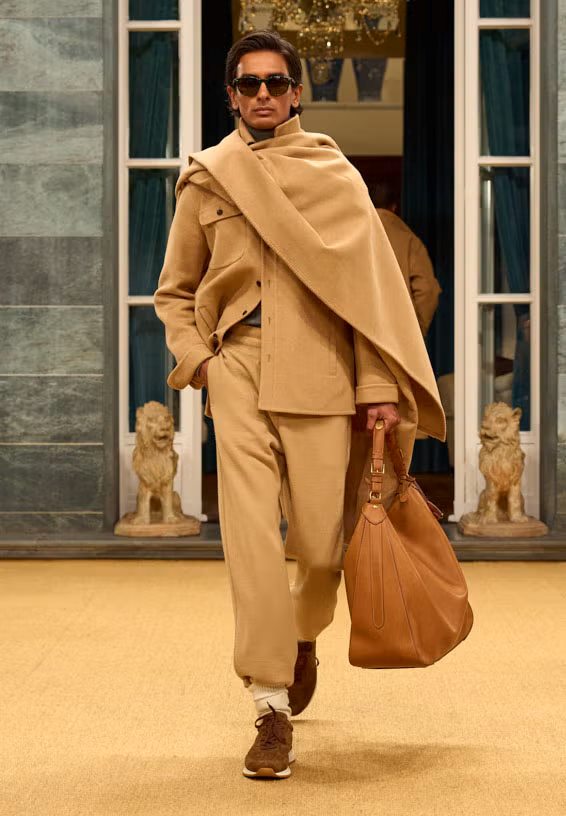 Peças utilitárias icônicas ganharam novas leituras por meio de combinações inesperadas de tecidos, enquanto itens essenciais do patrimônio — de malhas de lã escovada a agasalhos acolchoados — surgiram em tons profundos e rústicos, com proporções marcantes.