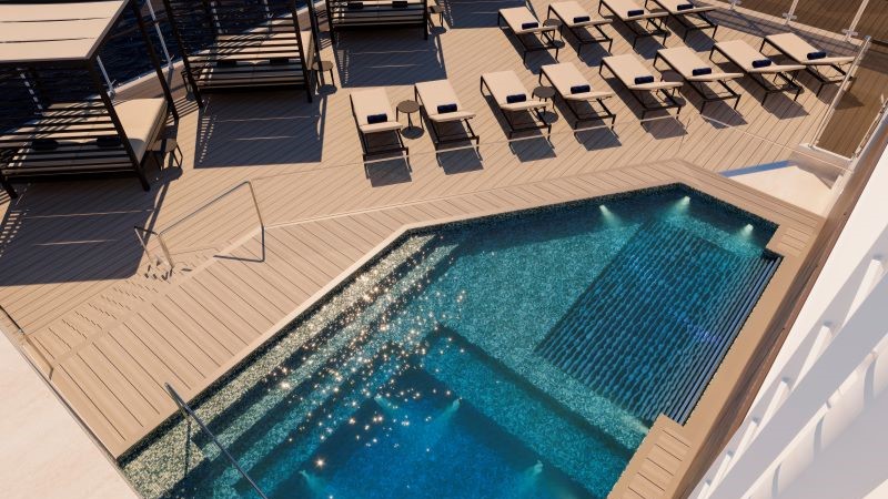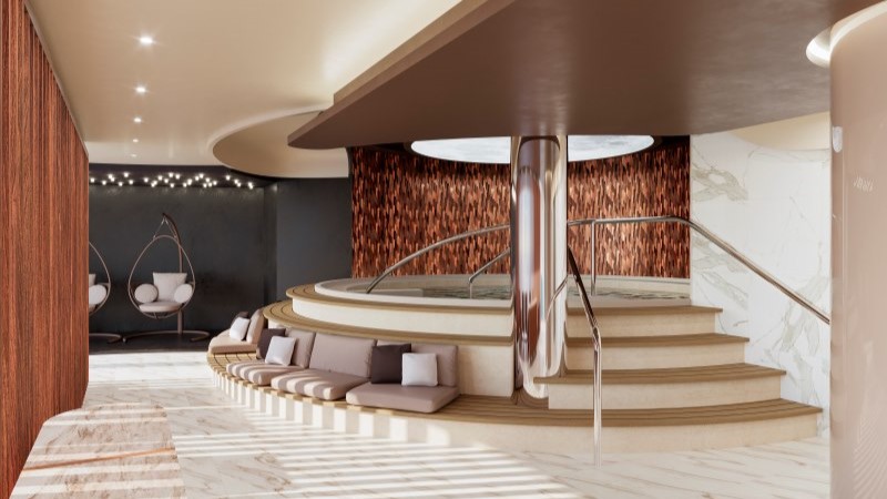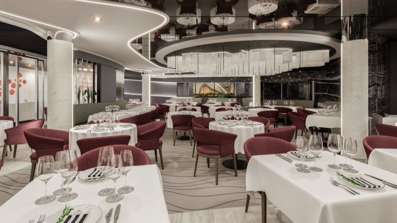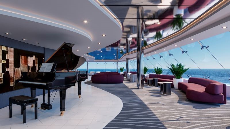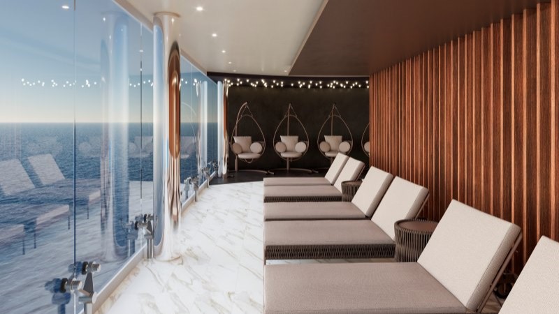 Um restaurante refinado com equipe de chefs e sommelier dedicada para harmonizações impecáveis de vinhos e pratos, um lounge envidraçado com janelas do chão ao teto para vistas panorâmicas do oceano e um solário privativo com piscina, hidromassagem, cabanas elegantes e um Grill & Bar ao ar livre para refeições gourmet sob o sol completam a lista.