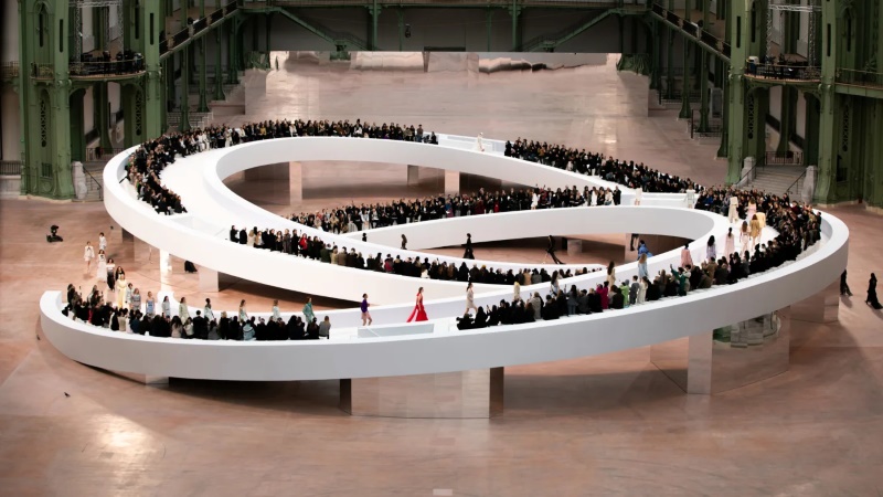 O Creation Studio da CHANEL, sob a direção artística de Willo Perron, orquestrou uma passarela que simbolizava essa eternidade com passarelas brancas elevadas formando os Cs duplos da marca e o símbolo do infinito. Este cenário minimalista serviu como pano de fundo para uma coleção que celebra a transformação da luz e das sombras ao longo do dia, refletindo o amor de Gabrielle Chanel pelas cores.