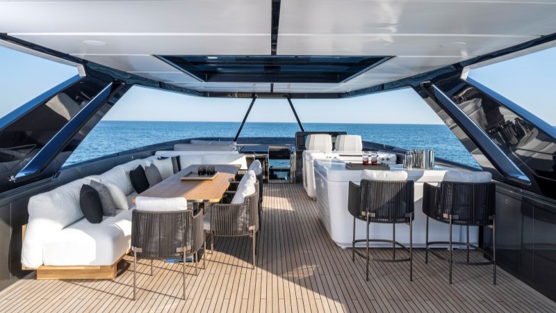 No flybridge, com cerca de 50m², o layout contempla lounge, mesa para refeições e cozinha gourmet, com opção de hard top fixo ou lâminas móveis. Na proa, o solário e o lounge em formato C complementam os espaços de convivência.