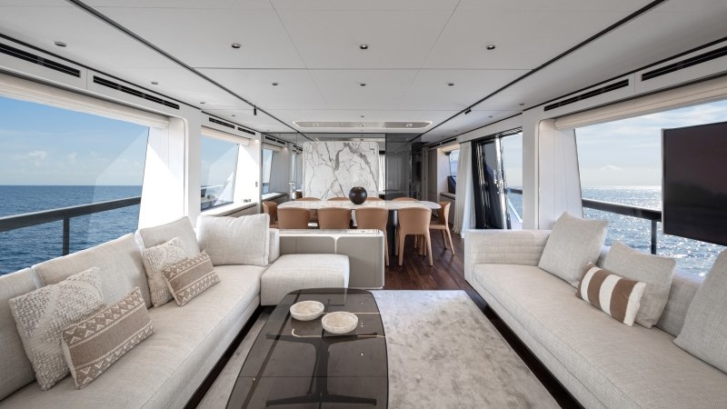 A integração entre interior e exterior é reforçada por amplas superfícies envidraçadas, incluindo janela de altura total na área de jantar. O salão principal, com quase 30m², conecta-se ao cockpit por meio de porta deslizante em vidro, ampliando a área social.