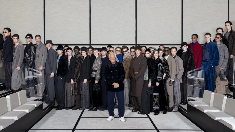 A coleção também apresenta elementos surpreendentes, como um longo casaco de pele de carneiro combinado com um terno formal e um chapéu de inspiração asiática, mostrando como Giorgio Armani habilmente mistura o tradicional com o eclético para contar uma nova história de estilo masculino.