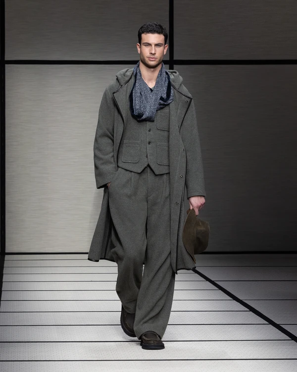 A coleção também apresenta elementos surpreendentes, como um longo casaco de pele de carneiro combinado com um terno formal e um chapéu de inspiração asiática, mostrando como Giorgio Armani habilmente mistura o tradicional com o eclético para contar uma nova história de estilo masculino.