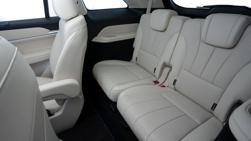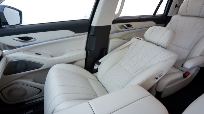 A segunda fileira traz bancos com 10 ajustes elétricos, apoios de pernas e lombar, dois modos de massagem com dois níveis de intensidade, ventilação e aquecimento independentes, persianas retráteis para privacidade e uma mesinha retrátil (posicionada atrás do encosto do banco do motorista).