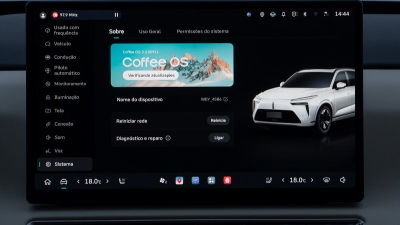 Compatível com Apple CarPlay e Android Auto sem fio, esse sistema permite personalização da interface, comandos de voz em português e exibe um modelo 3D interativo do veículo na tela da central multimídia com acesso rápido a funções como teto solar, ar-condicionado e portas.