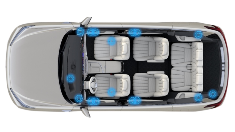 O sistema de som Hi-Fi de 1.670 W RMS com 16 alto-falantes proporciona uma experiência imersiva, com palco sonoro central, tweeters de alta frequência e subwoofer dedicado.