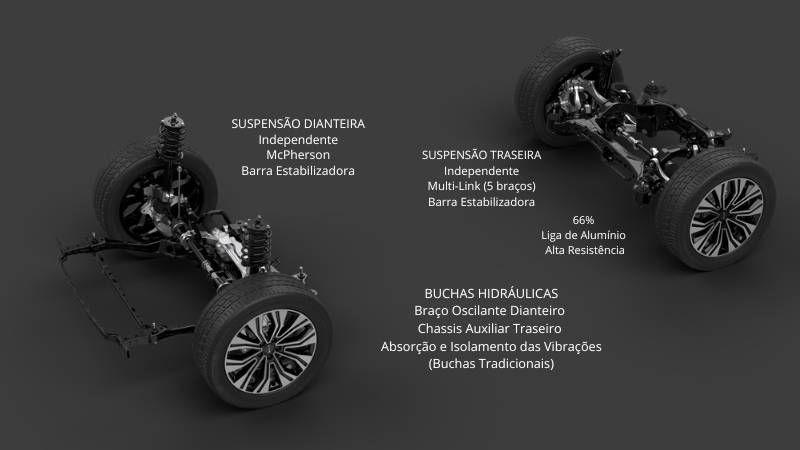 O Wey 07 GWM traz suspensões independentes na dianteira (McPherson) e traseira (multi-link de 5 braços), ambas com barras estabilizadoras e buchas hidráulicas, além de braço oscilante dianteiro e chassi auxiliar traseiro, que favorece a absorção e aumenta o isolamento das vibrações, mantendo o equilíbrio entre conforto e estabilidade.