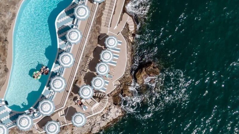 O Beach Club Amalfi do Hotel Miramalfi é uma obra-prima esculpida na falésia, acessada por um elevador que desce diretamente até a costa. Este espaço exclusivo combina o charme natural da Costa Amalfitana com toques de sofisticação italiana. A piscina de água salgada, que parece se fundir com o mar, é o coração do Beach Club, cercada por espreguiçadeiras estrategicamente posicionadas para maximizar a vista.