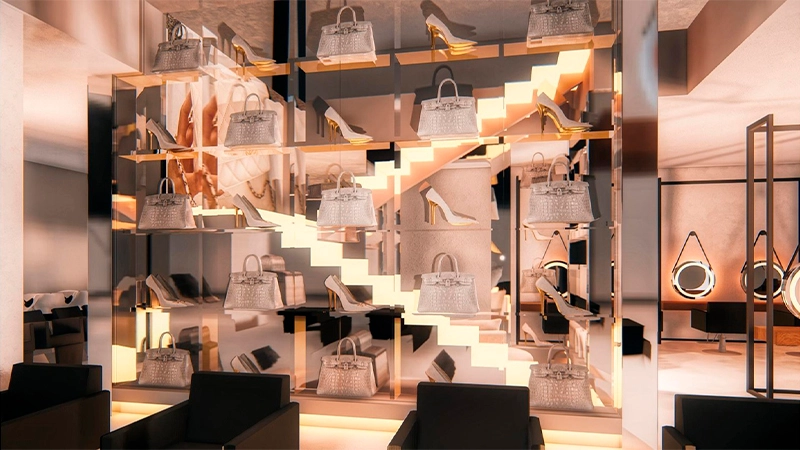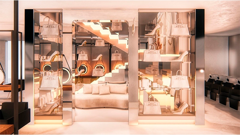 A loja em São Paulo no R.O.M Concept integra espelho, vidro e madeira em uma atmosfera clean e luxuosa, projetada para inspirar a descoberta de peças únicas. O espaço convida as consumidoras a explorarem um universo de sofisticação e exclusividade.