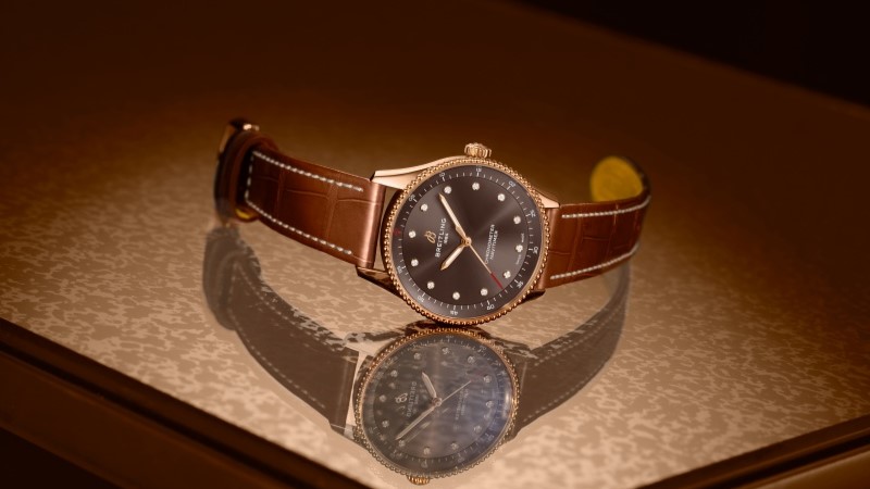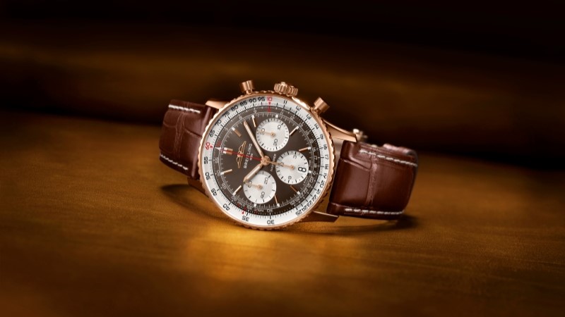 Combinando com o mostrador, a pulseira é de couro de crocodilo marrom com uma fivela de ouro vermelho. Em contraste com a luneta serrilhada clássica do cronógrafo, ambos os Navitimers com função apenas de horas e minutos vêm com a luneta chanfrada – uma referência aos primeiros Navitimers da década de 1950.