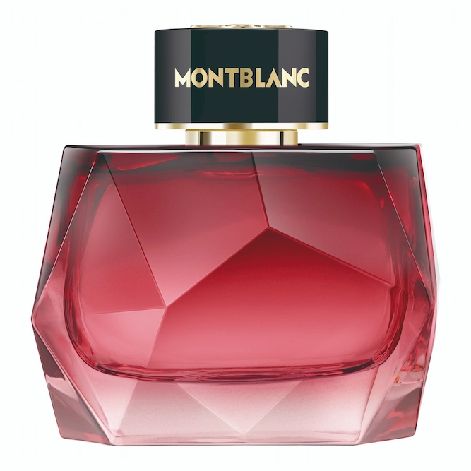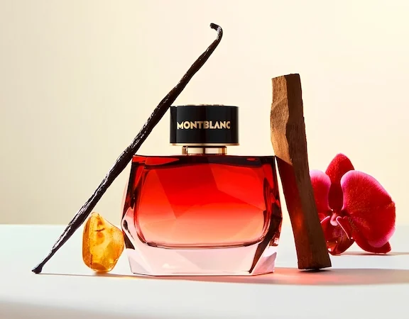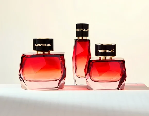 O design traduz a mesma opulência da fragrância. O vidro em degradê vermelho captura a luz de forma magnética, enquanto a tampa preta com o emblema Montblanc em dourado reforça a preciosidade da criação.