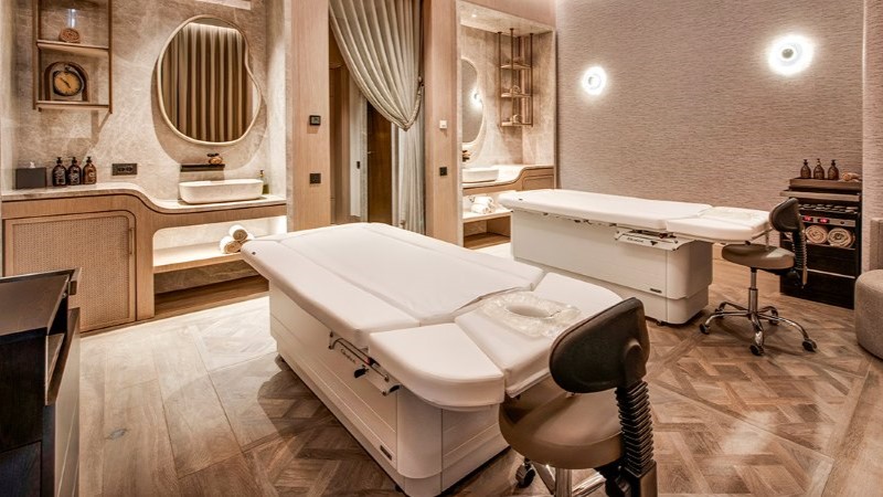 A experiência de bem-estar é elevada a outro patamar com uma área privativa de spa dentro da própria suíte, incluindo sauna, banho turco, sala de massagens e espaços dedicados ao relaxamento.