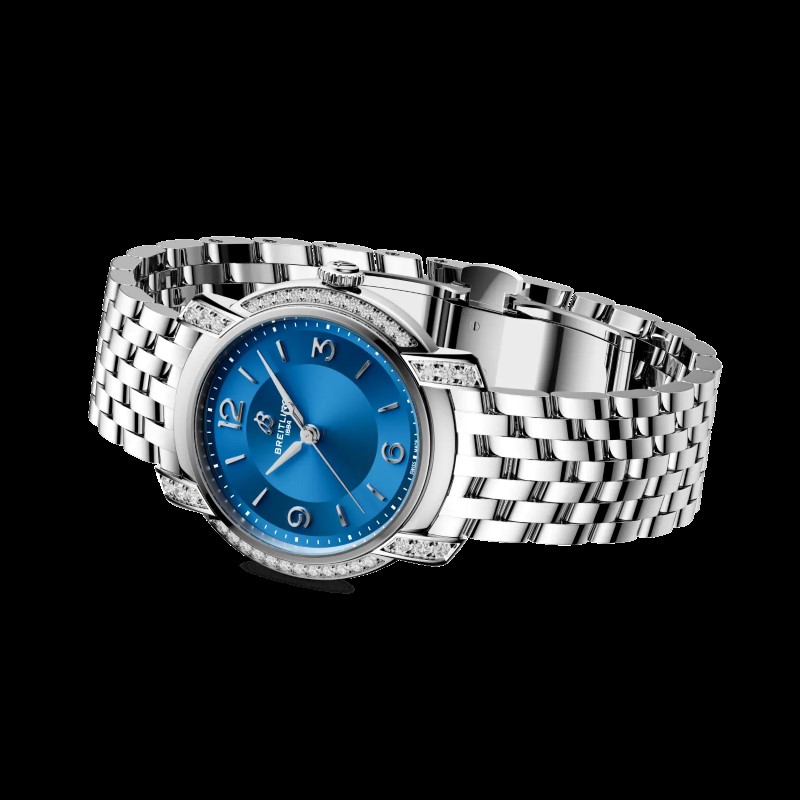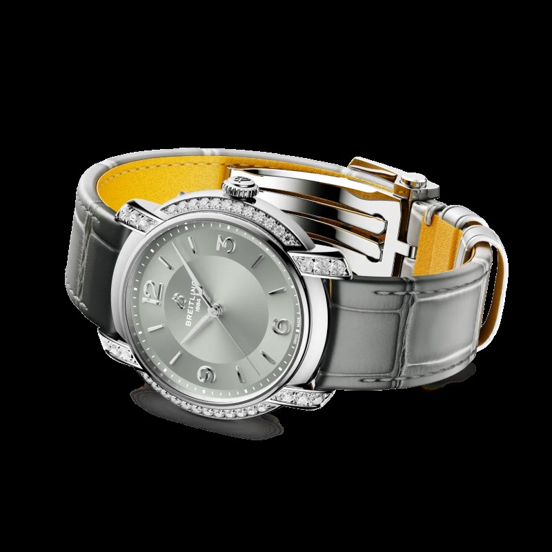 Lançada em outubro de 2025, a Lady Premier Automatic 36 exsuda elegância. Este relógio Breitling feminino tem caixa de 36 milímetros, com 9.9 mm de espessura. É um ícone de luxo moderno. O mostrador em madrepérola, com algarismos minimalistas e ponteiros em losango, reflete os anos 1940. Seu brilho sutil combina glamour vintage e modernidade. Cada detalhe é uma obra de arte.