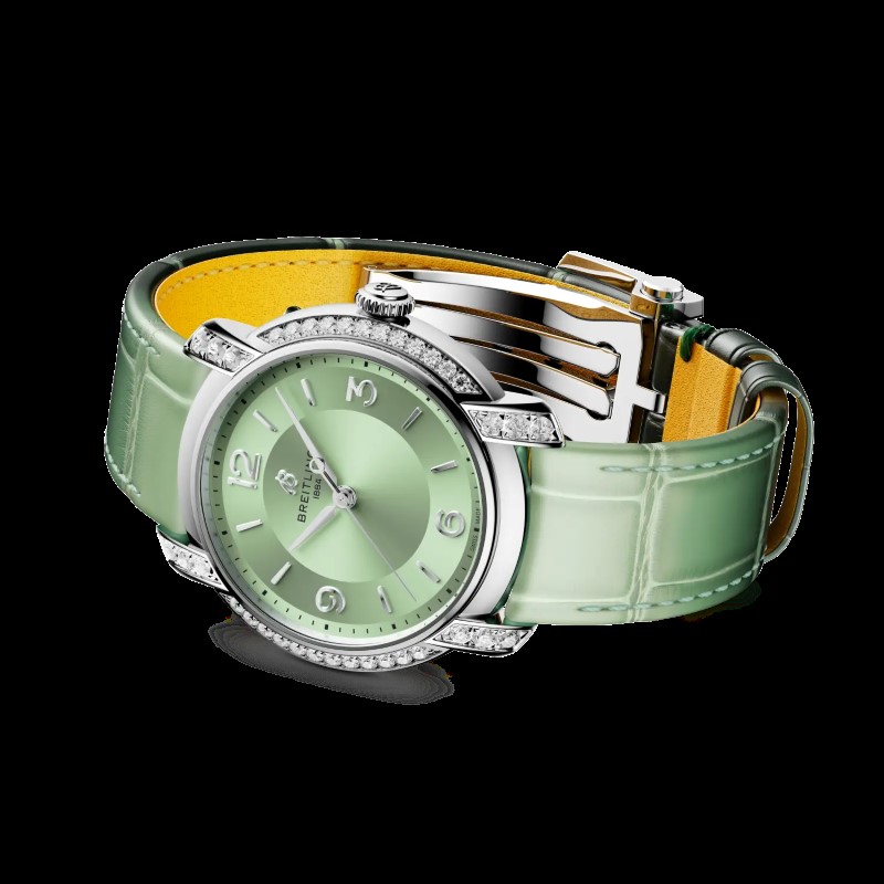 O calibre Breitling 10 automático, com 42 horas de reserva de marcha, garante precisão suíça. A pulseira de pele de jacaré verde com fecho báscula adiciona requinte. O vidro de safira oferece clareza superior. Resistente à água até 10 bars, acompanha compromissos diurnos ou eventos noturnos. Esta estreia define a essência de quem a usa.