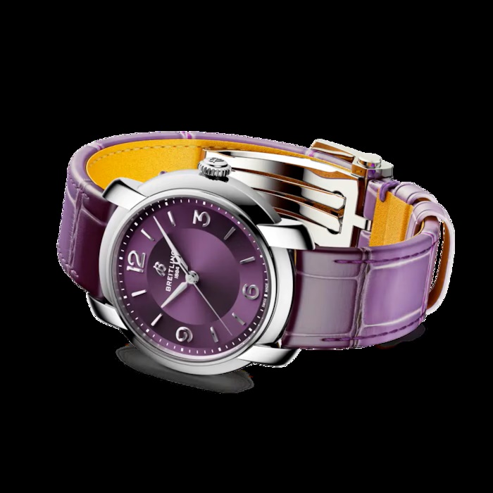 O mostrador lilás perolado, com algarismos minimalistas e ponteiros em losango, evoca o glamour dos anos 1940. Seu brilho suave encanta o olhar. É um relógio de pulso de luxo que eleva o estilo.