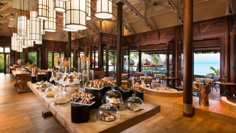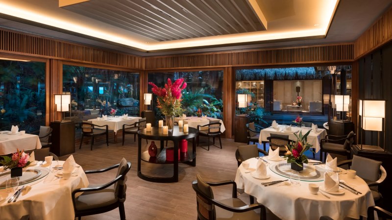 O dia começa com um café da manhã inspirado na Polinésia, enquanto o jantar apresenta pratos criativos da culinária francesa, harmonizados com rótulos selecionados da adega. Música acústica ao vivo embala os jantares às quintas-feiras. O código de vestimenta é esporte fino, e os cardápios são sazonais, sujeitos a alterações.