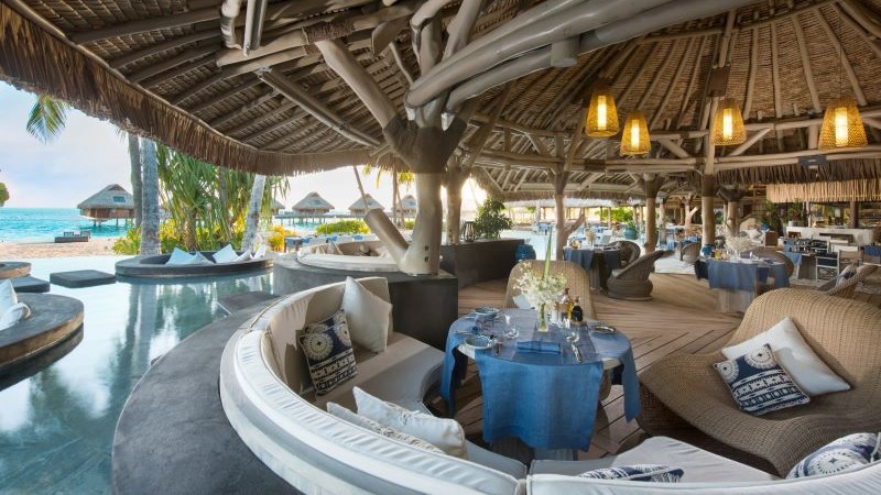 Bar aquático integrado à piscina infinita, o Tarava é ideal para petiscos leves e bebidas de inspiração local. Coquetéis polinésios podem ser apreciados diretamente no bar submerso, enquanto o pôr do sol colore o horizonte.