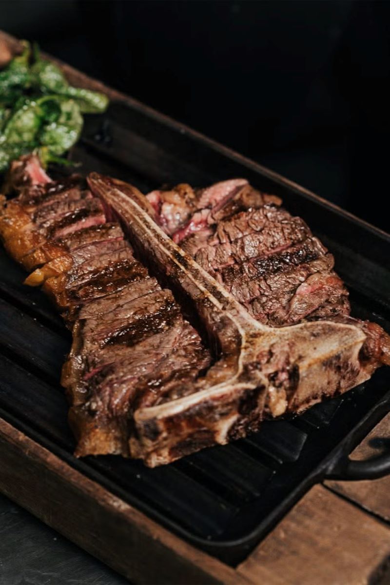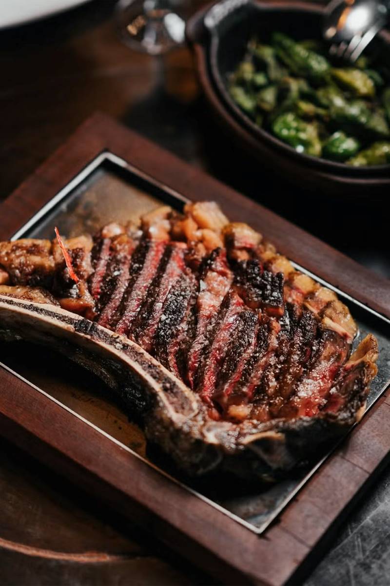 Um dos pratos mais pedidos é o Tomahawk dry-aged por 60 dias, com cerca de 2,5 kg, ideal para compartilhar. Nos pescados, ganham destaque o Lenguado Evaristo e o Besugo, preparados na brasa.