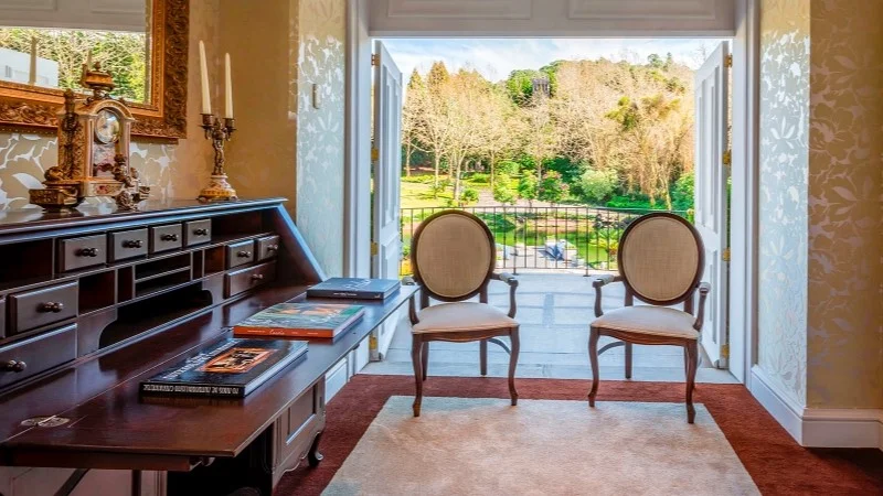 No amplo living temos Smart Tv, home theater, mac mini e confortável sofá. Mas a sugestão aqui é desligar a Tv e aproveitar a vista de suas duas sacadas que oferecem verdadeiros cenários de cinema: de um lado, o Vale do Quilombo e de outro a vista do belo jardim e do lago do hotel. A suíte Diamante é de encantar e tornar inesquecível sua experiência no Castelo.