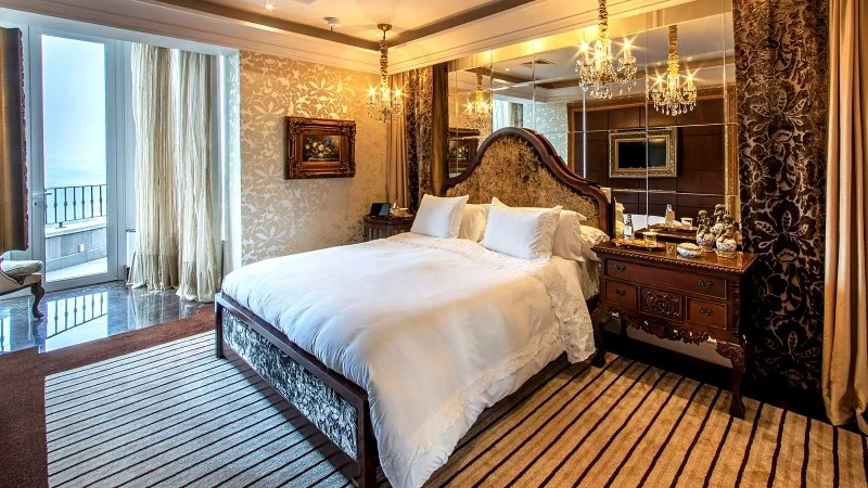 A maior suíte do hotel combina a predominância das cores bege e marrom e convida para experiências singulares. Tem dois banheiros separados, em mármore italiano: um com chuveiro e outro com banheira de hidromassagem com vista maravilhosa. No quarto, uma deliciosa cama King Size com lençóis egípcios 1000 fios é o centro das atenções.